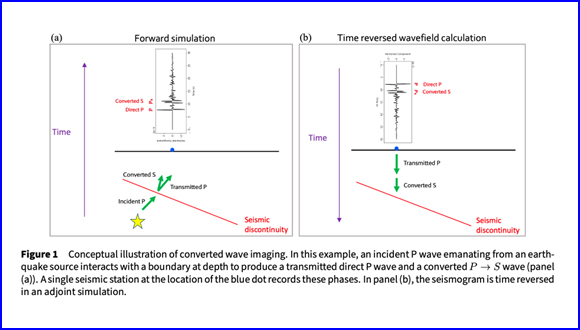 האיור מציג דיאגרמה מושגית של דימות הפוך בזמן (RTM) באמצעות גלים מומרי-סוג. מדובר בשיטת דימות סייסמית המשתמשת בגלים מומרי-סוג – כלומר, גלים העוברים המרה מגל P ישיר לגל S מומר, או מגל S ישיר לגל P מומר – לצורך איתור אי-רציפויות סייסמיות, כגון לוחות טקטוניים תת-צוללים (subducting slabs), ולמידה על תכונותיהם.